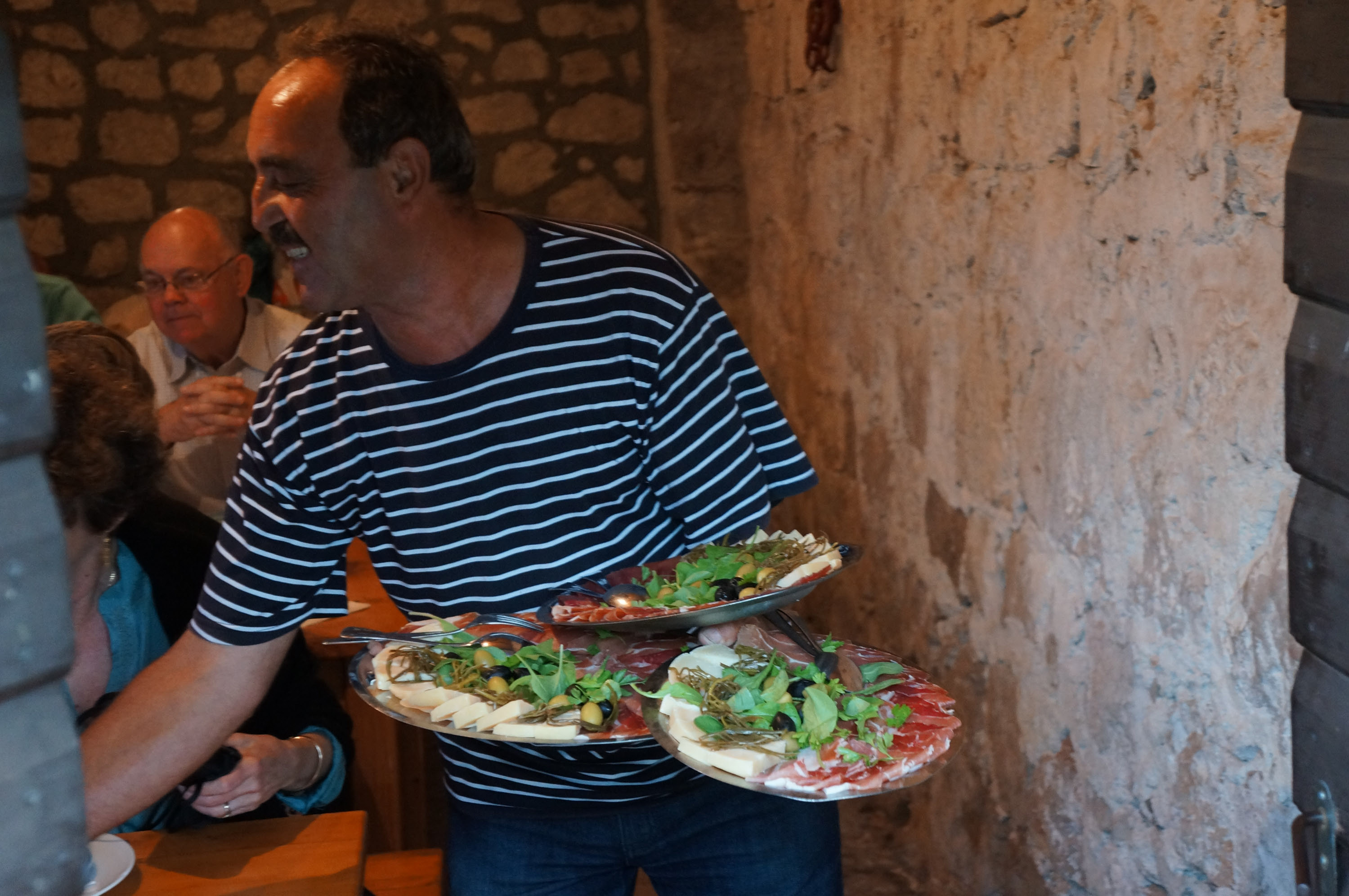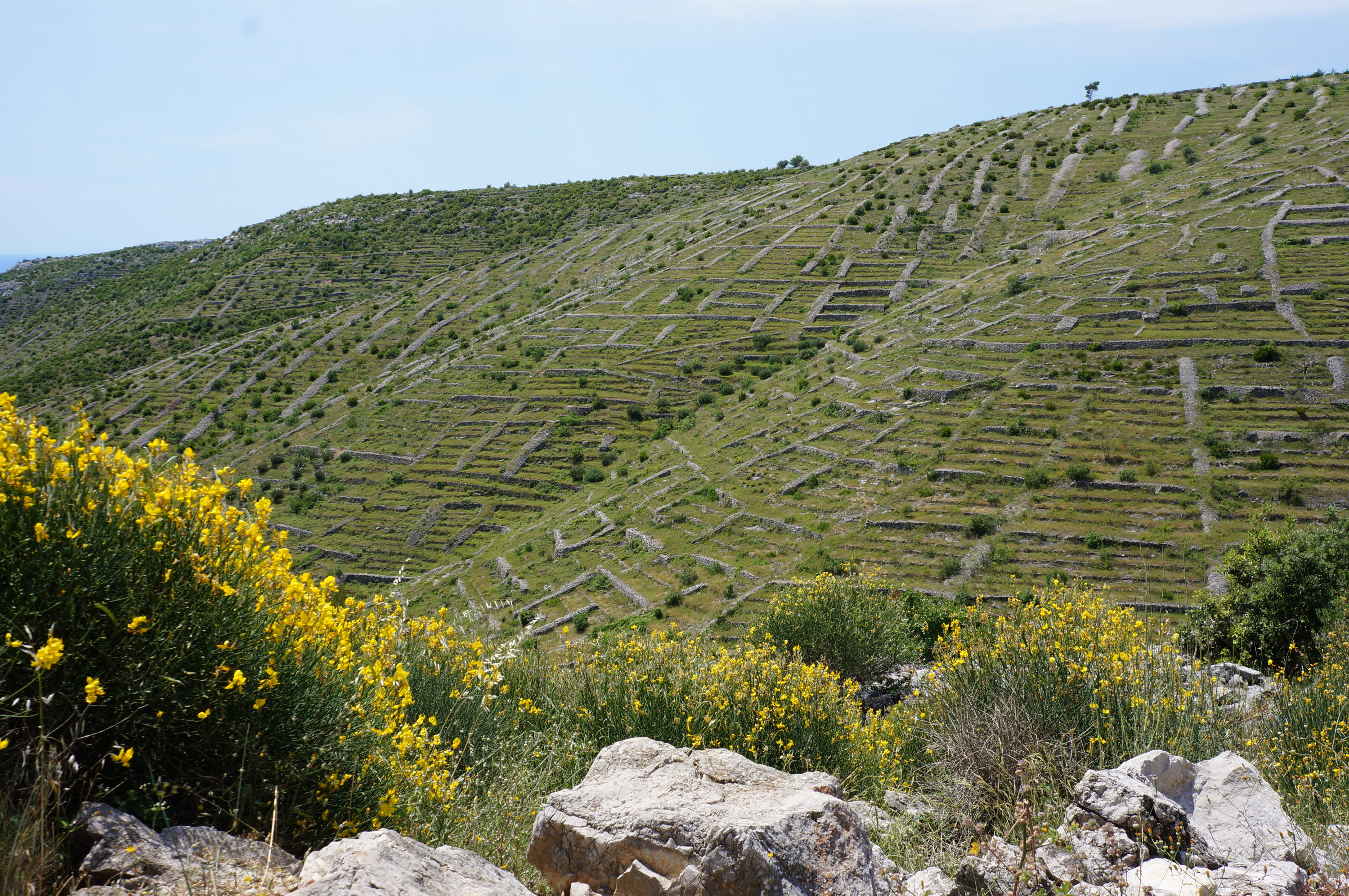 ANOTHER EXCURSION takes us through Hvar’s mountainous terrain back to Stari Grad, for a historical tour. Our guide is a young mother who not long ago decided, with her husband, to return to Hvar after earning Master’s degrees and working in professional jobs on the mainland. The pull of this gorgeous terrain was overwhelming, trumping the economic advantages of their professional careers. In addition to his job and her guiding, they both work a plot of family land, which they cleared of the ubiquitous, small stones that cover every square foot of the island, with their own hands.