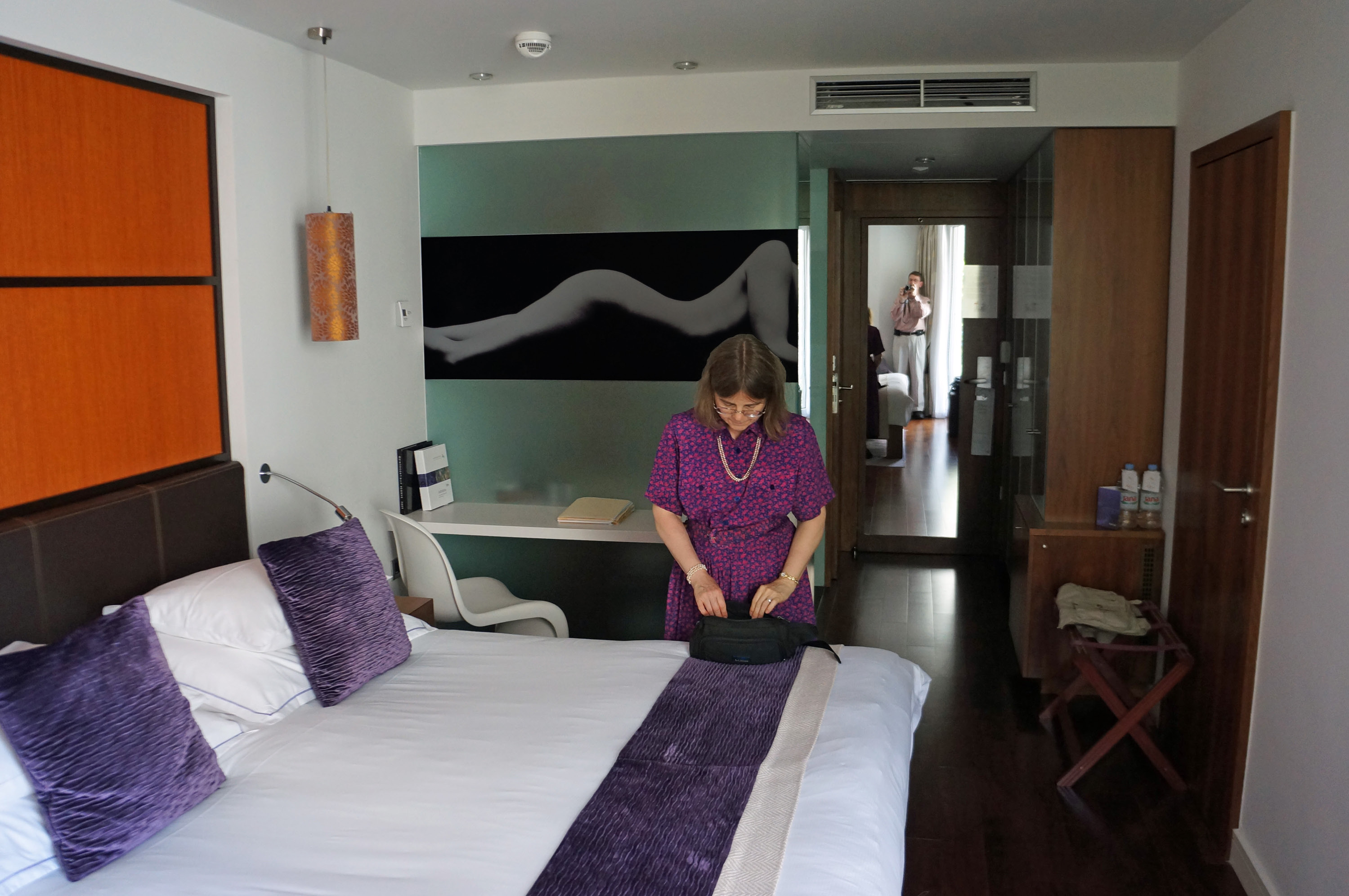 Our hotel, the Adriana, sits on the edge of the town’s central marina. Our room is a marvel of space-efficiency worthy of one of those IKEA displays that demonstrates just how much can be done with 250 square feet. Within no more than that much space, our room tastefully packs all of the needed amenities, provides a door to a small balcony looking across a courtyard to the harbor, and leaves enough space for an ample kitchenette, if the hotel ever should be converted into condo-ettes.